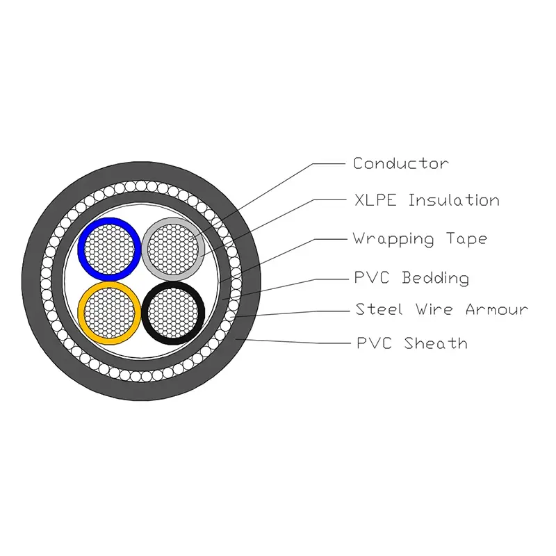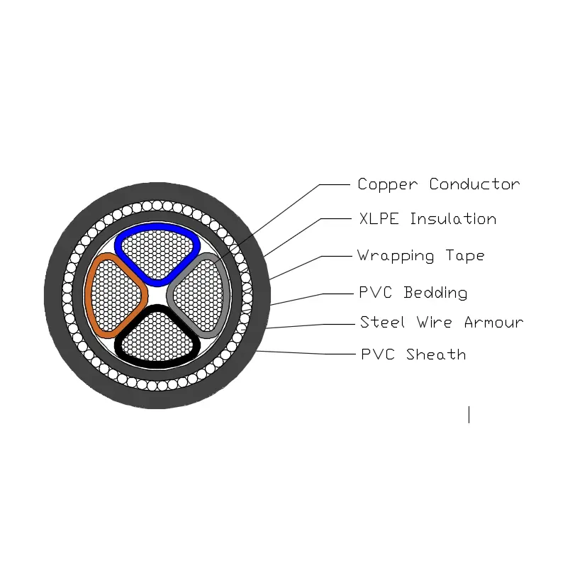 XLPE izolyasiyalı PVC örtüklü SWA elektrik kabeli T1R mis keçiricidən, XLPE izolyasiyasından, PVC yataq dəstindən, Polad zirehlərdən və PVC örtükdən ibarətdir.