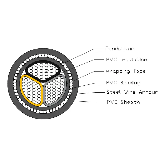 BS 6346 Elektrik kabeli T1R mis keçiricidən, PVC izolyasiyadan, PVC yataq dəstindən, Polad zirehlərdən və PVC örtükdən ibarətdir.