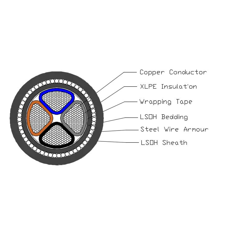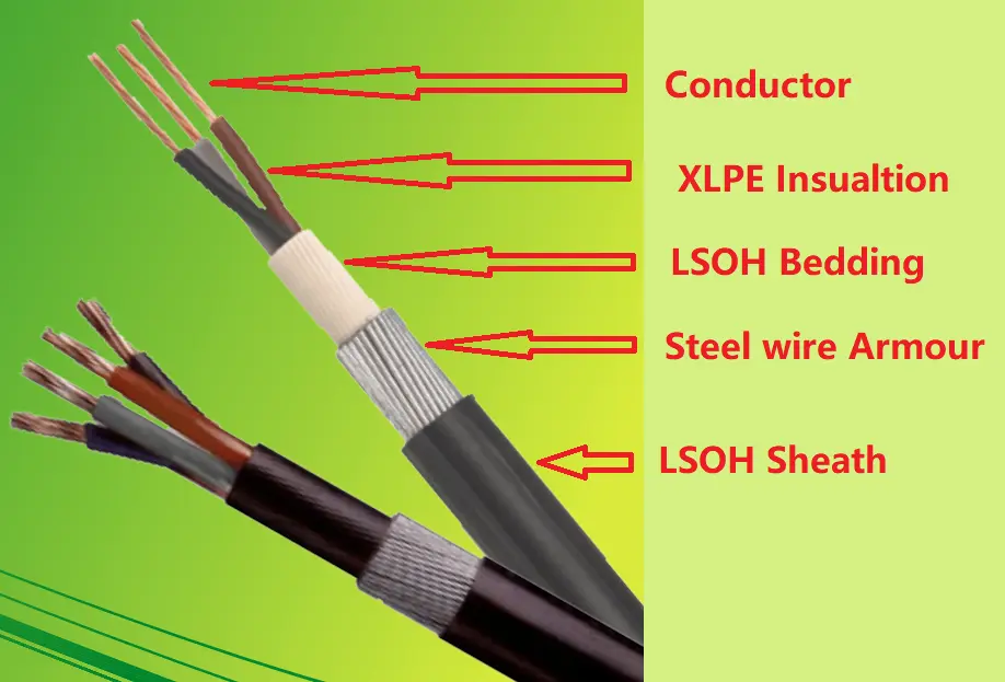 BS 6724 Elektrik kabeli T1R mis keçiricidən, XLPE izolyasiyasından, PVC yataq dəstindən, Polad zirehlərdən və LSOH qabığından ibarətdir.